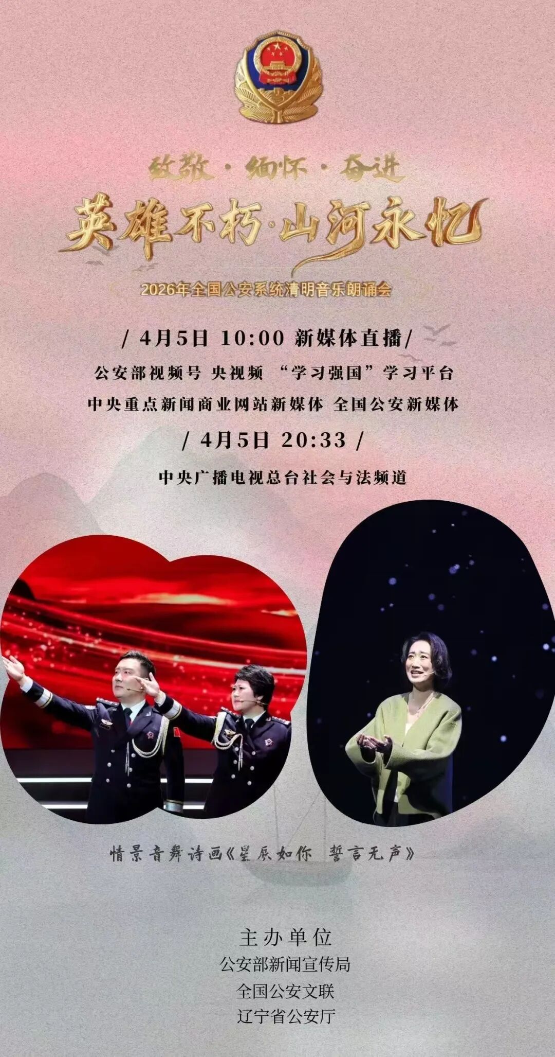 4月5日,由公安部新闻宣传局、全国公安文联、辽宁省公安厅联合主办的“致敬·缅怀·奋进—英雄不朽 山河永忆”2026年全国公安系统清明音乐朗诵会正式播出。此次清明音乐朗诵会生动讲述了“时代楷模”董亦军及全国公安系统二级英雄模范郑亮、谢雨丰、杨春华等公安英烈的感人事迹,深情刻画了2025年牺牲民警辅警舍生取义、英勇无畏的英雄群像,引发全国公安队伍强烈共鸣。
